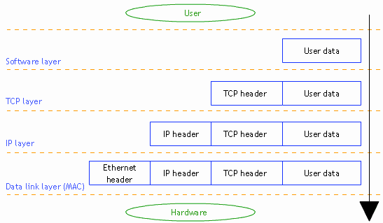 The image above shows the encapsulation of the each protocol in the ethernet interface stack. It all starts with the software layer, which has a piece of data that it wants to send over the network. Even this data usually has a format (eg. HTTP, FTP protocols), although not shown in the image. The user data first gets a TCP header including the source and destination port number. Then the IP header is added, containing the source and destination IP address. Finally the data link layer adds the ethernet header, which specifies the MAC numbers of the source and destination. This is the data that is actually sent over the wires. As you can see there's a lot of overhead in an TCP/IP package. The overhead can be minimized by choosing a large enough data size for the package. Luckily winsock will arrange this for you.